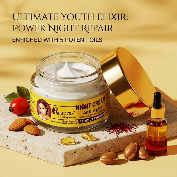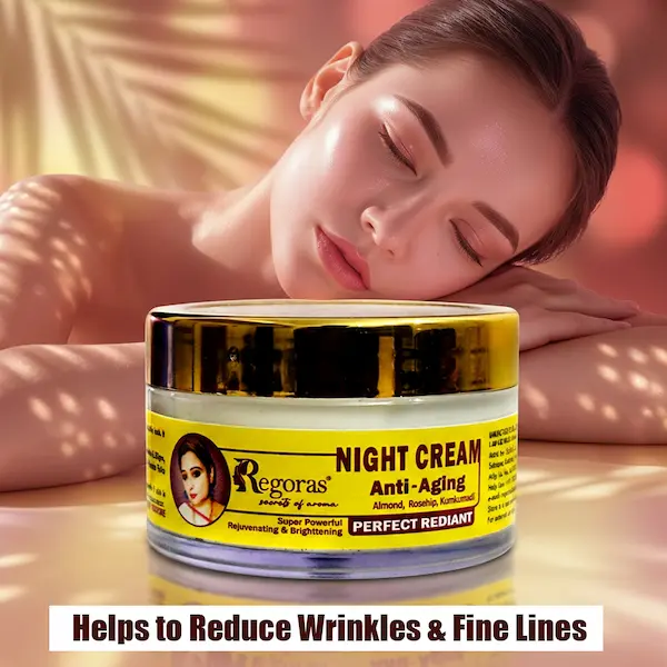 Experience the power of Ayurveda and Aromatherapy with Regoras Anti-Aging Night Cream – your secret to youthful, glowing skin!