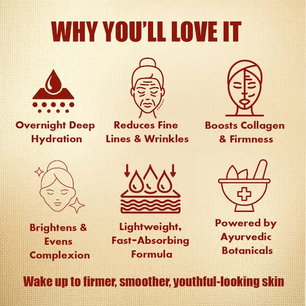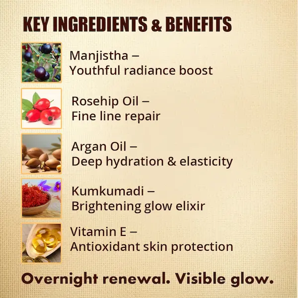 Infused with the rejuvenating power of Rosehip Oil, Argan Oil, Kumkumadi, Almond Oil, and Vitamin E, it nourishes your skin from within—leaving it youthful, radiant, and glowing by morning.