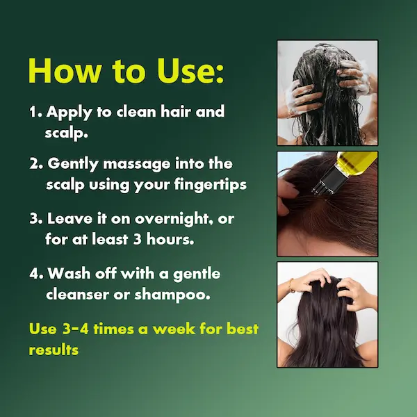 On dry hair, apply the oil directly to the scalp and hair roots.