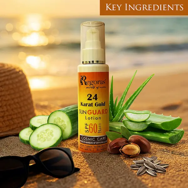 Advanced Sun Protection with Hydration, Nourishment and no white cast. Shield your skin with Regoras 24K Gold Sun Guard Lotion, an ultra-protective SPF 60 sunscreen infused with the goodness of 24K Gold, Pro-Vitamin B5, Cucumber Extract, Aloe Vera, Jojoba, and Sunflower Seed Extract.